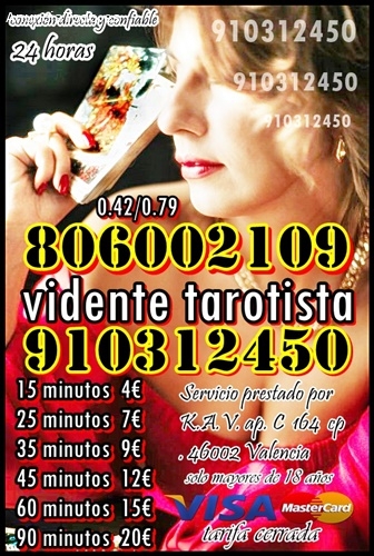 Tarot con visa cerrada ,Videntes Recomendadas por sus aciertos ,baraja Española 910312450 prefijo fuera de España (00 34) PROMOCIÓN 4 € 15 min/ 7 € 25min/ 9€ 35min. / 12€ 45min . 16€ 60 MINU. 20€ 90min ATENCIÓN LAS 24 HORAS LA LLAMADA SE CORTA SOLA / Tarot línea directa, SOLO MAYORES DE 18 años Servicio prestado por K.A.V. ap. c 164 c.p.46002 VALENCIA.OFERTAS INCREIBLES