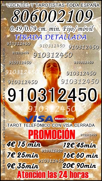 Tarot con visa cerrada ,Videntes Recomendadas por sus aciertos ,baraja Española 910312450 prefijo fuera de España (00 34) PROMOCIÓN 4 € 15 min/ 7 € 25min/ 9€ 35min. / 12€ 45min . 16€ 60 MINU. 20€ 90min ATENCIÓN LAS 24 HORAS LA LLAMADA SE CORTA SOLA / Tarot línea directa 806002109 - 0.49/0.79 cm. min. Fijo/ móvil , SOLO MAYORES DE 18 años Servicio prestado por K.A.V. ap. c 164 c.p.46002 VALENCIA.OFERTAS INCREIBLES