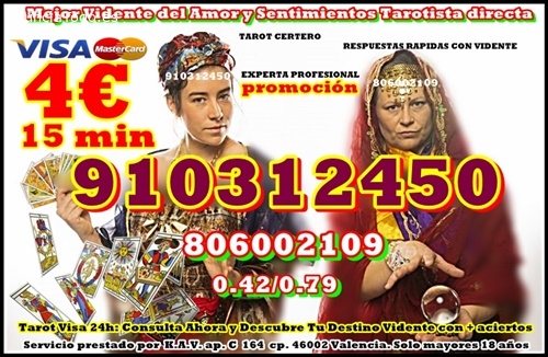 Tarot con visa cerrada ,Videntes Recomendadas por sus aciertos ,baraja Española 910312450 prefijo fuera de España (00 34) PROMOCIÓN 4 € 15 min/ 7 € 25min/ 9€ 35min. / 12€ 45min . 16€ 60 MINU. 20€ 90min ATENCIÓN LAS 24 HORAS LA LLAMADA SE CORTA SOLA / Tarot línea directa 806002109 - 0.49/0.79 cm. min. Fijo/ móvil , SOLO MAYORES DE 18 años Servicio prestado por K.A.V. ap. c 164 c.p.46002 VALENCIA.OFERTAS INCREIBLES