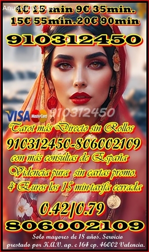 VIDENTE SUPERIOR Tarot, tarot económico, tarot fiable, tarot Videntes Recomendadas por sus aciertos 910312450 prefijo fuera de España (00 34) PROMOCIÓN 4 € 15 min/ 7 € 25min/ 9€ 35min. / 12€ 45min . 16€ 60 MINU. 20€ 90min ATENCIÓN LAS 24 HORAS SOMOS UN TAROT CON TARIFA CERRADA LA LLAMADA SE CORTA SOLA / Tarot línea directa 806002109 - 0.49/0.79 cm. min. Fijo/ móvil , SOLO MAYORES DE 18 años Servicio prestado por K.A.V. ap. c 164 c.p.46002 VALENCIA.OFERTAS INCREIBLES
