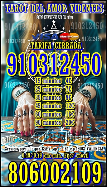 TAROT VISA /Videntes y tarotistas Meraki visas 9 € 35 min - 4€15 min -7€ 25 MIN- 10€ 40 min 15€ 55MIN - 17€ 70min - 20€ 90min-910 312450 / 806002109 - 0,42/0,79 cm € min red fija y red móvil. tarot profesional especialistas en amor y relaciones, aquí la solución a tus problemas en el amor acude a mí y juntos, con ayuda del tarot y mi videncia, sabremos qué rumbo debes tomar para solucionar ese problema que tanto te aqueja. las 24 horas los 365 días del año a su entera disposición. equipo Único de videntes y tarotistas te esperan capacitados 100%. servicio prestado por k.a.v. ap. c 164 cp. 46002 valencia. solo mayores de 18 años