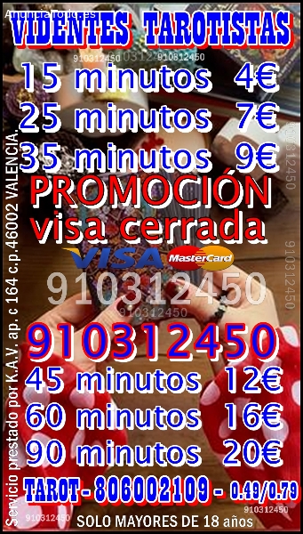 TAROT VISA /Videntes y tarotistas Meraki visas 9 € 35 min - 4€15 min -7€ 25 MIN- 10€ 40 min 15€ 55MIN - 17€ 70min - 20€ 90min-910 312450 / 806002109 - 0,42/0,79 cm € min red fija y red móvil. tarot profesional especialistas en amor y relaciones, aquí la solución a tus problemas en el amor acude a mí y juntos, con ayuda del tarot y mi videncia, sabremos qué rumbo debes tomar para solucionar ese problema que tanto te aqueja. las 24 horas los 365 días del año a su entera disposición. equipo Único de videntes y tarotistas te esperan capacitados 100%. servicio prestado por k.a.v. ap. c 164 cp. 46002 valencia. solo mayores de 18 años