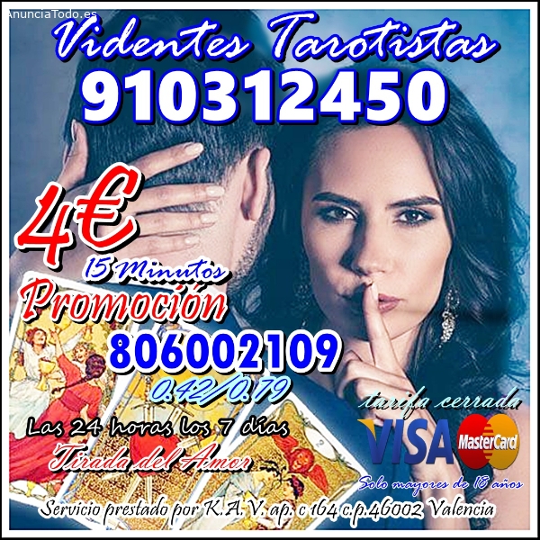 Aquí la solución a tus problemas en el amor 910312450 acude a mí y juntos, con ayuda del tarot y mi videncia, sabremos qué rumbo debes tomar para solucionar ese problema que tanto te aqueja. servicio prestado por k. a. v. ap. c 164 cp. 46002 valencia. solo mayores de 18 años. 910 312 450 prefijo fuera de españa (00 34) visa 4 € 15 min/ 7 € 25min/ 9€ 35min. / 12€ 45min . 17€ 70. 20€ 90min .24 horas los 365 días del año a su entera disposición€ 806 002 109 coste min. 0,42/0,79 cm € min. red fija/.red móvil impuestos incluidos