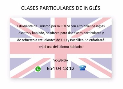 Estudiante de Turismo por la EUTM con alto nivel de inglésescrito y hablado, se ofrece para dar clases particulares y